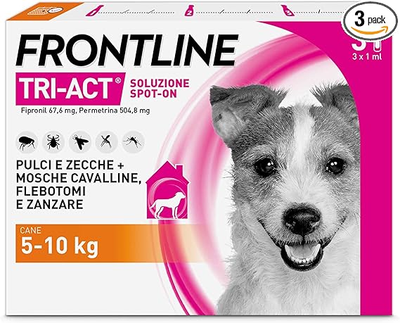 FRONTLINE TriAct Cani Taglia S (5-10 kg). TRATTAMENTO OTTIMALE: elimina in modo rapido e duraturo pulci, zecche, zanzare e pappataci; protegge dal rischio di trasmissione della Leishmaniosi.