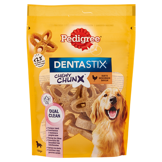 Pedigree Dentastix Chewy Chunx offre al vostro cane un gustoso snack tutto da masticare, in grado di prendersi cura dei suoi denti. Si tratta di un delizioso snack tutto da masticare che delizia il cane con il suo gusto straordinario, contribuendo continuamente alla sua igiene dentale.